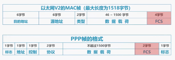 例如。这是以太网版本 2 的 MAC 帧格式,其帧尾中包含了一个长度为 4 字节的帧检验序列 FCS 字段,其作用就是让接收方的数据链路层检查帧在传输过程中是否产生了误码,这是点对点协议 PPP 的帧格式,其帧尾中也包含了一个长度为两字节的帧检验序列,FCS 字段,其作用也是让接收方的数据链路层检查正在传输过程中是否产生了误码。