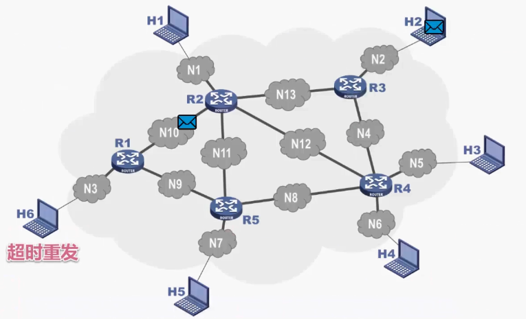 我们来举例说明,主机 H6 给主机 H2 发送的分组,到达了路由器 R5,由于此时 R5 的输入队列快满了,R5 根据自己的分组丢弃策略,将该分组丢弃,这是一种分组丢失的情况。
