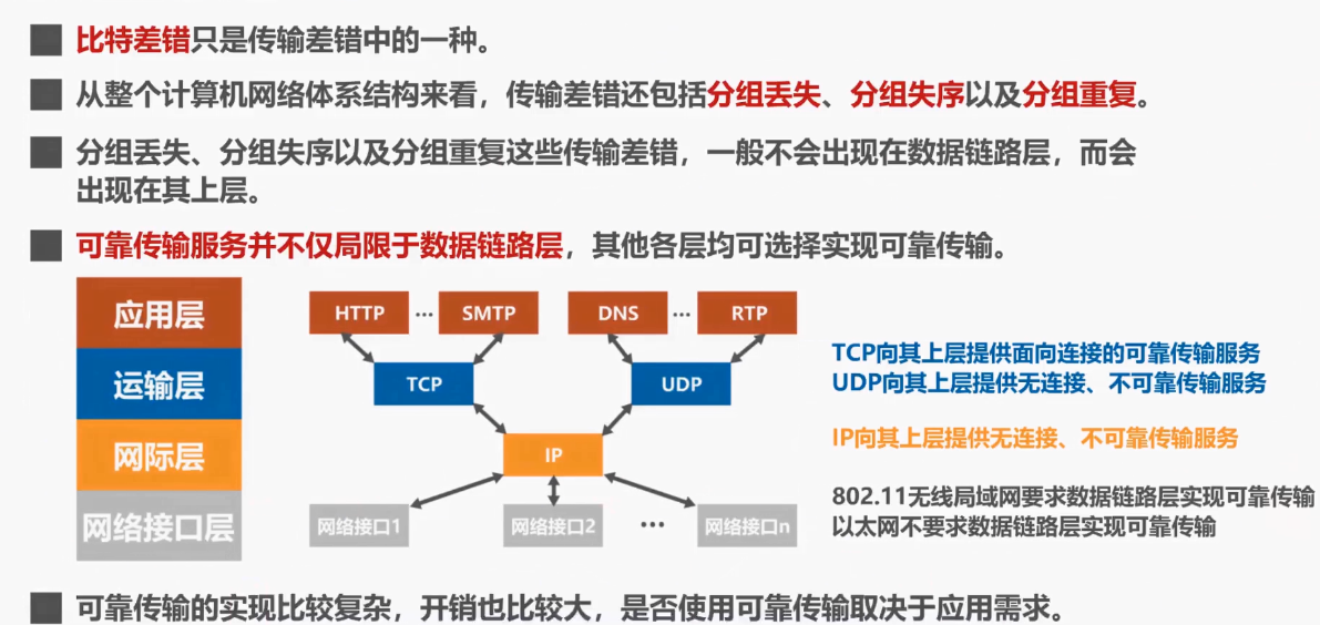 分组丢失,分组失序以及分组重复这些传输差错,一般不会出现在数据链路层,而会出现在其上层。因此可靠传输服务并不仅局限于数据链路层,其他各层均可选择实现可靠传输服务。