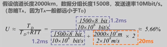 我们来举例说明,假设信道长度为 2000 公里,数据分组长度为 1500 字节,发送速率为 10 兆比特每秒,忽略 TA,因为 TA 一般都远小于 TD,可以计算出信道利用率约为 5.66%,这是数据分组的发送时延 TD,这是往返时间 RTT。