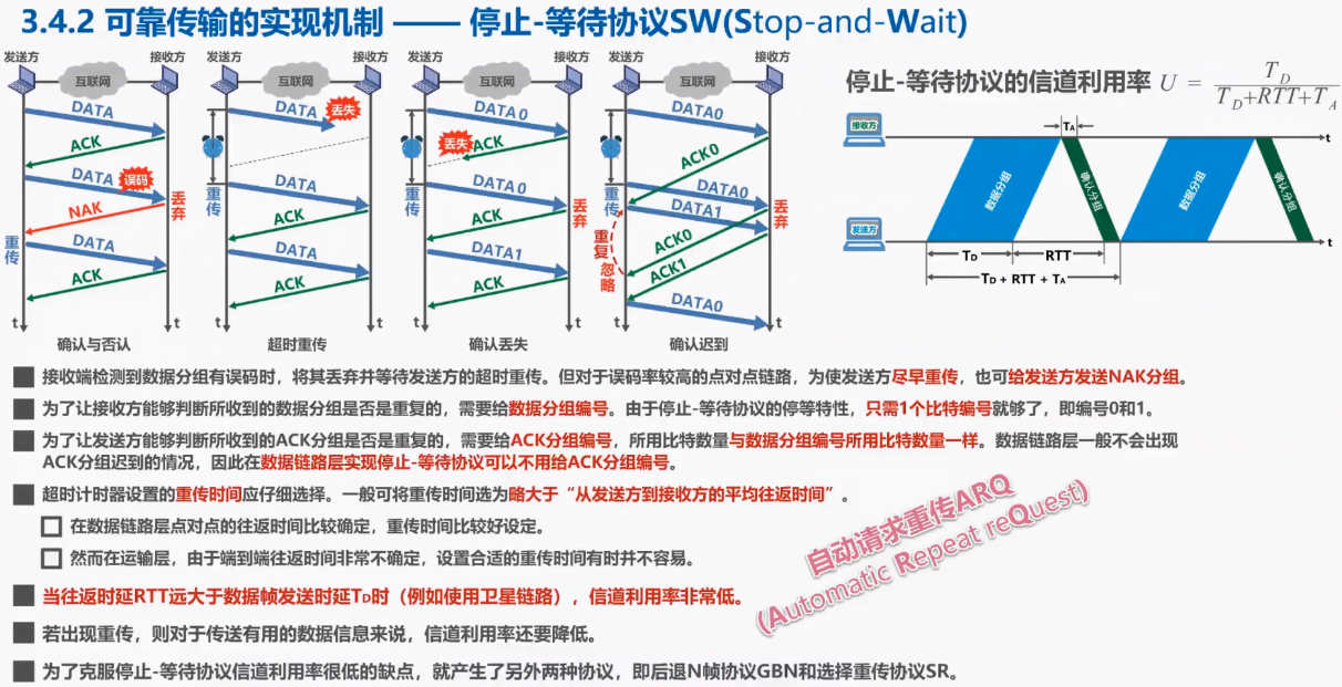 需要提醒大家注意的是,这三种可靠传输实现机制的基本原理,并不仅限于数据链路层,可以应用到计算机网络体系结构的各层协议中,希望同学们在学习时不要把思维局限在数据链路层,而应放眼于整个网络体系结构。