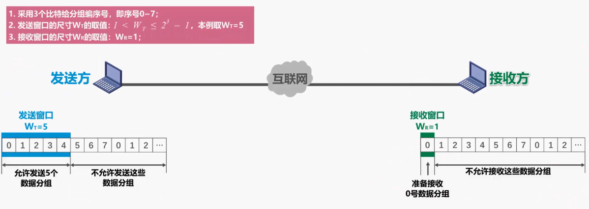 - 这是我们刚刚举例说明过的,发送窗口和接收窗口的尺寸问题,就不再赘述了。发送方可在未收到接收方确认分组的情况下,将序号落在发送窗口内的多个数据分组全部发送出去,接收方可接收未按需到达,但没有误码,并且序号落在接收窗口内的数据分组。