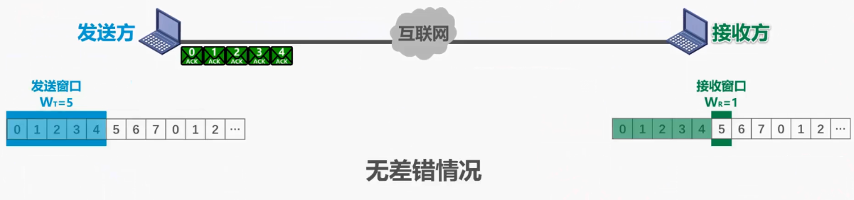 - 0~4 号确认分组,经过互联网的传输,正确到达了发送方,每接收一个发送窗口就向前滑动一个位置,这样就有新的序号落入了发送窗口,发送方可以将收到确认的数据分组,从缓存中删除了
