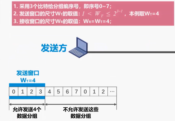 当序号增加到 7 是,下一个序号又从 0 开始,发送窗口的尺寸,WT 的取值范围是大于 1,小于等于 2 的 3 次方-1 次。其中的三是构成分组序号的比特数量,本例取 WT 的值为 4,如图所示序号落在发送窗口内的这 4 个数据分组可以连续发送,而序号落在发送窗口外的数据分组不允许发送。