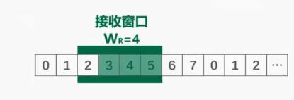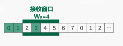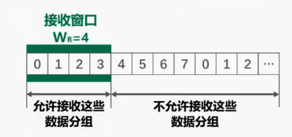 接收窗口的尺寸 WR 的取值,一般情况下可以发送窗口的尺寸 WT 的取值相同,在本例中其值为 4,如图所示序号落在接收窗口内的这 4 个数据分组允许接收,而序号落在接收窗口外的数据分组不允许接收
