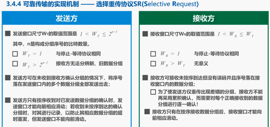 为了进一步提高性能,可设法只重传出现误码的数据分组。因此接收窗口的尺寸 w 不应再等于 1,而应大于 1,以便接收方先收下失序到达,但无误码,并且序号落在接受窗口内的那些数据分组,等到所缺分组收齐后,再一并送交上层。这就是本节课所要介绍的选择重传协议。需要注意的是选择重传协议,为了使发送方仅重传出现差错的数据分组,接收方不能再采用累积确认,而需要对每个正确接收到的数据分组进行逐一确认。