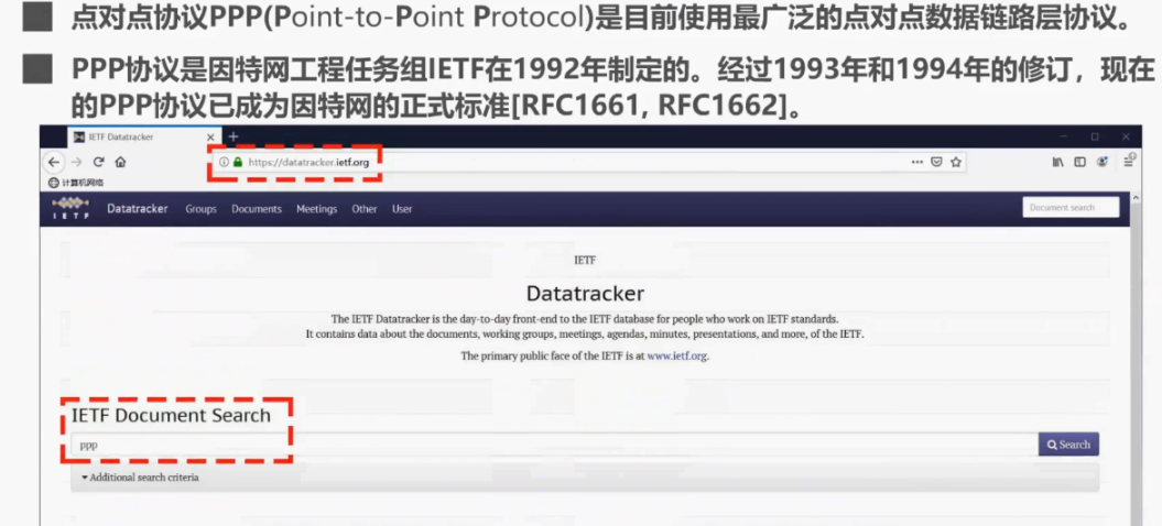 PPP 协议是因特网工程任务组 IEFT 在 1992 年制定的,经过 1993 年和 1994 年的修订,现在的 PPP 协议已成为因特网的正式标准。我们可以在 IEFT 官方网站的相关页面,搜索并查看 PPP 协议的相关 RFC 文档: