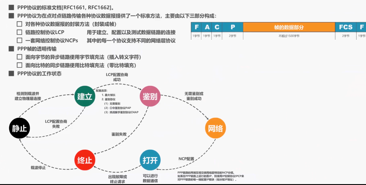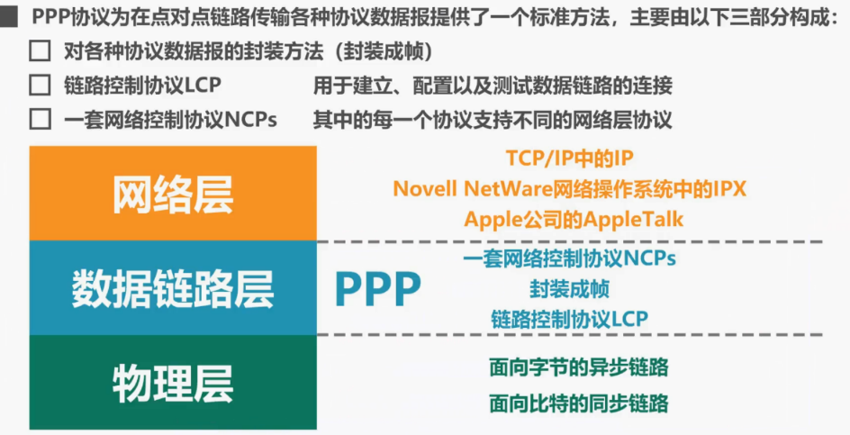 PPP 协议为在点对点链路传输各种协议数据报提供了一个标准方法,主要由以下三部分构成: