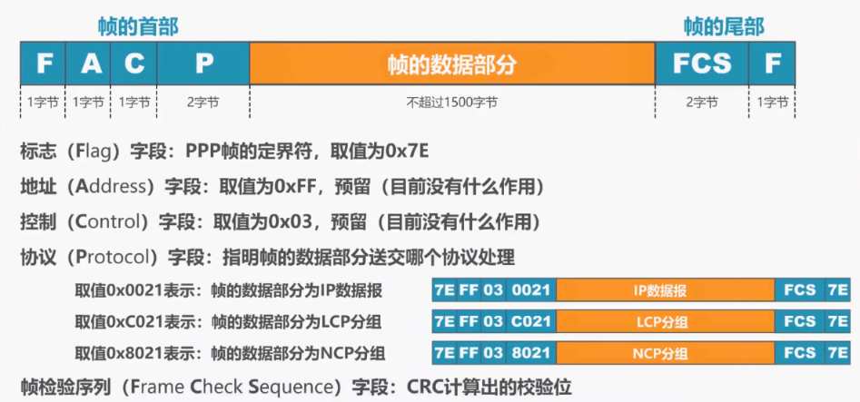 帧首和帧尾部中的标志字段是 PPP 间的定界符,取值为 16 进制的 7E。帧首部中的地址字段取值为 16 进制的 FF,控制字段取值为 16 进制的 03,最初曾考虑以后再对这两个字段的值进行其他定义,但至今也没有给出,可见这两个字段实际上并没有携带 PPP 帧的信息,帧首部中的协议字段,指明了帧的数据部分,应送交哪个协议处理。
