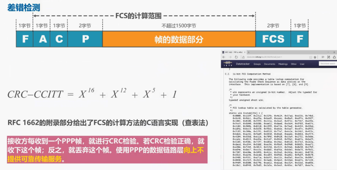 接下来我们来看看 PPP 协议是如何进行差错检测的,PPP 帧的尾部包含有一个两字节的帧检验序列 FCS 字段,使用循环冗余校验 CRC 来计算该字段的取值。采用的生成多项式如下所示。RFC 1662 文档的附录部分,给出了 FCS 的计算方法的 C 语言实现。为了减少对 CPU 的占用,采用查表法来实现 FCS 的计算范围,如图所示。