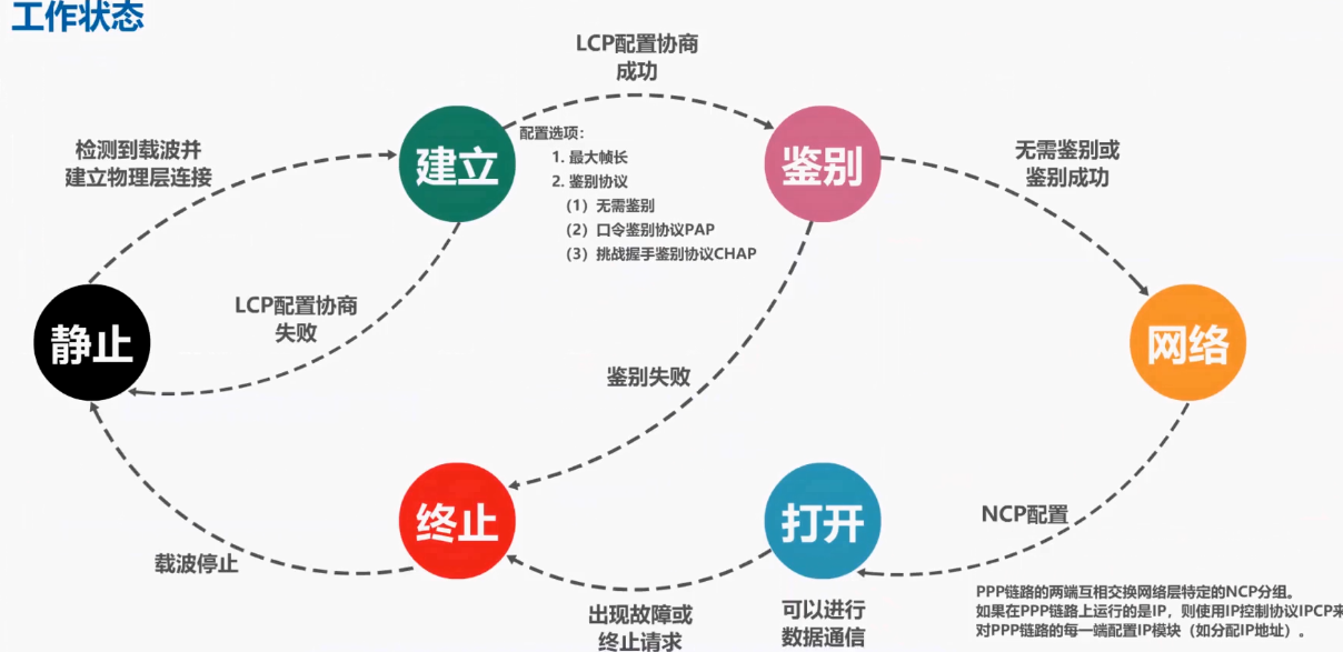 - 这时链路控制协议 LCP 开始协商一些配置选项,若协商成功则进入鉴别状态,若协商失败则退回到静止状态。