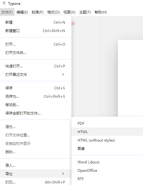 在 Typora 的菜单上,可以看到导出选项,支持 PDF、HTML、图片、Word 等等: