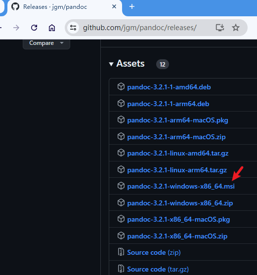 Pandoc 的官网详细介绍了在各个操作系统上的 安装方法,以 Windows 为例,直接去其 GitHub 的发行页面下载即可: