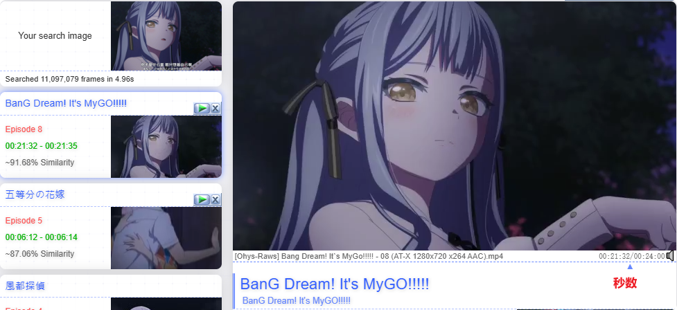 通过截图追溯获取对应的动画场景,并显示出该截图属于哪部动画作品,以及准确的集数,甚至精确到秒,并提供几秒的预览: