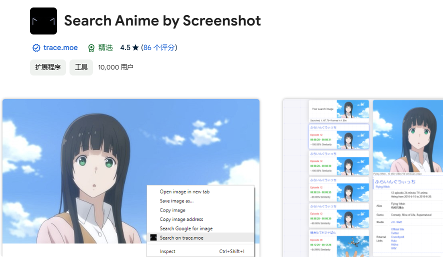 还提供浏览器扩展(可以在官网底部找到) Search Anime by Screenshot,直接右键搜图: