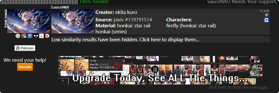 上传图片,即可获得该图片的来源以及链接,甚至有 P 站画师 ID: