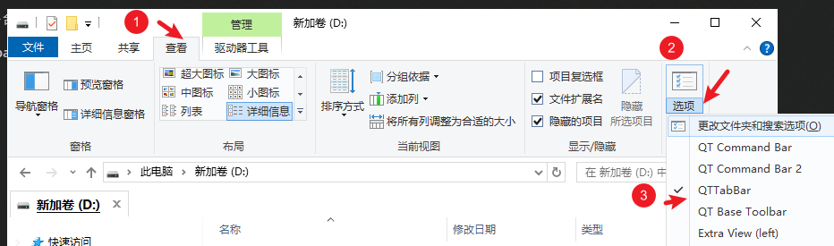 随便打开一个文件夹,点击查看 —— 选项 —— 勾选 QTTabBar 即可。
