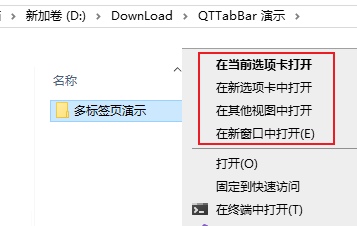 打开文件夹时,可以右键选择是在当前选项卡中打开,还是在新选项卡中打开:
