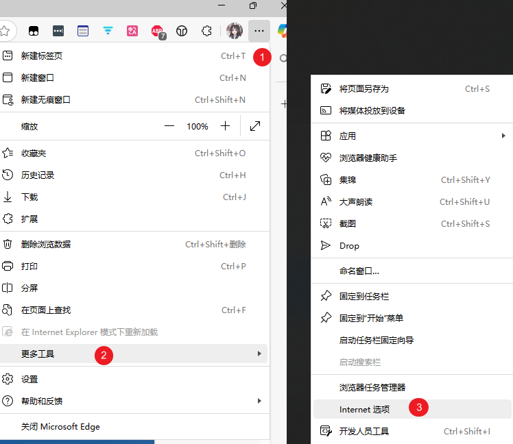 而如果你用的是 Edge,则打开路径为:设置 → 更多工具 → Internet 选项
