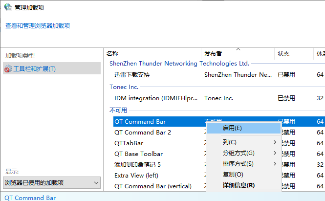 找到 QTTabBar 相关的扩展,右键设置为启用: