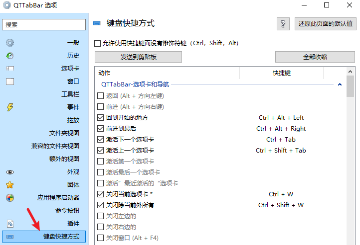 快捷键也是非常值得一说的功能。QTTabBar 支持丰富的快捷键,几乎所有功能都可设置: