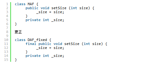 简单的getter/setter方法应该被置成final,这会告诉编译器,这个方法不会被重载,所以,可以变成”inlined”,例子: