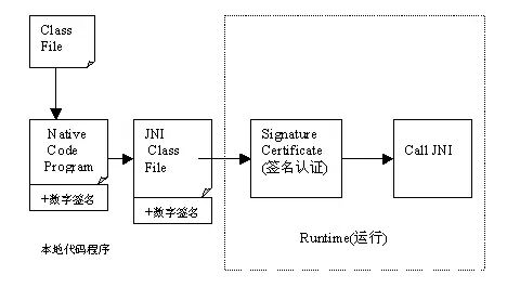 为了保证这些本地代码不被修改和替代,通常需要对这些代码进行数字签名。在使用这些本地代码之前,往往需要对这些本地代码进行认证,确保这些代码没有被黑客更改。如果签名检查通过,则调用相关JNI方法。这种保护方式示见下图