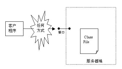 最简单的方法就是让用户不能够访问到Java Class程序,这种方法是最根本的方法,具体实现有多种方式。例如,开发人员可以将关键的Java Class放在服务器端,客户端通过访问服务器的相关接口来获得服务,而不是直接访问Class文件。这样黑客就没有办法反编译Class文件。目前,通过接口提供服务的标准和协议也越来越多,例如 HTTP、Web Service、RPC等。但是有很多应用都不适合这种保护方式,例如对于单机运行的程序就无法隔离Java程序。这种保护方式如下图所示。对Class文件进行加密