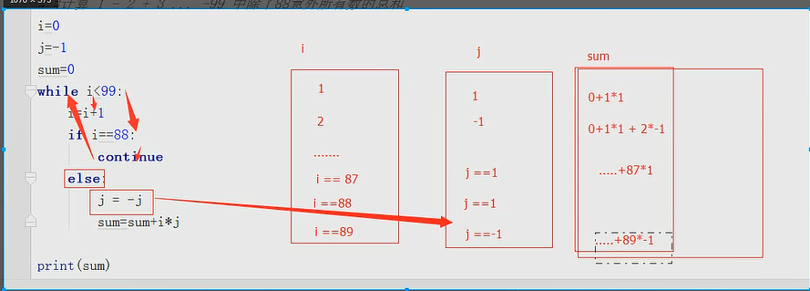 #计算 1 - 2 + 3 ... + 99 中除了88以外所有数的总和 count = 0 sum_1 = 0 while count < 100: if count == 88: count = count + 1 continue if count % 2 == 0: sum_1 -= count else : sum_1 += count count += 1 print(sum_1) #计算 1 - 2 + 3 ... -99 中除了88意外所有数的总和 i=0 j=-1 sum=0 while i<99: i=i+1 if i==88: continue else: j = -j sum=sum+i*j print(sum)