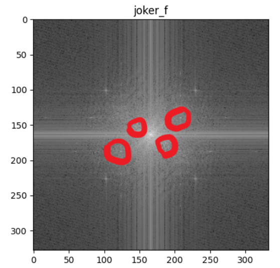 1 #滤波,去除四个频域点 2 f1shift[152:154,145:146] = 0 3 f1shift[139:141,207:210] = 0 4 f1shift[188:190,124:126] = 0 5 f1shift[176:178,187:190] = 0 6 7 f2shift = np.fft.ifftshift(f1shift) #逆中心化 8 jok_new = np.fft.ifft2(f2shift) #逆傅里叶 9 jok_new = np.abs(jok_new) 10 11 cv2.imwrite('joker_new.bmp',jok_new)