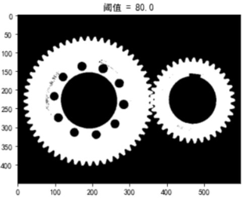1 import cv2 2 import numpy as np 3 import matplotlib.pyplot as plt 4 5 plt.rcParams['font.sans-serif']=['SimHei'] 6 plt.rcParams['axes.unicode_minus']=False 7 8 gears = cv2.imread('gears.bmp',0) 9 '''对图像进行阈值分割''' 10 thres, Out1 = cv2.threshold(gears, 0, 255, cv2.THRESH_OTSU) #大津阈值分割 11 cv2.imwrite(f'gears_binary(阈值={thres}).bmp', Out1) 12 plt.subplot(111), plt.imshow(Out1,'gray'), plt.title(f'阈值 = {thres}'), plt.show()