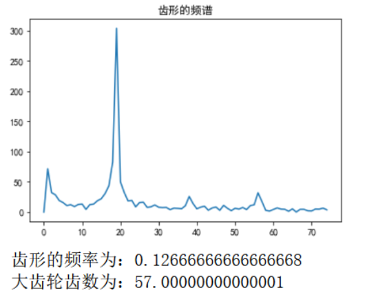 1 '''取变换后图像齿形中间连续部分片段,通过傅里叶变换得到频率''' 2 def get_curve(polar_img): 3 '''取齿形''' 4 lengths = [] 5 for row in range(150, 300): # 截取长度为150的齿形 6 for col in range(polar_img.shape[1]-1, 300, -1): 7 if polar_img[row, col] == 255: 8 lengths.append(col) 9 break 10 return lengths 11 12 def get_Frequence(polar_img): 13 '''计算频率''' 14 y = get_curve(polar_img) 15 y = y - np.mean(y) 16 Fourier = np.fft.fft(y) 17 A = np.abs(Fourier) 18 x = [i for i in range(0, 75) ] 19 plt.plot(x, A[:75]), plt.savefig('傅里叶幅值图') 20 return list(A[:75]).index(max(A[:75]))/150 21 22 Fs = get_Frequence(Polar_img) 23 print(f'齿形的频率为:{Fs}') 24 gear_num = Fs * Polar_img.shape[0] #根据频率计算齿数 25 print(f'大齿轮齿数为:{gear_num}')