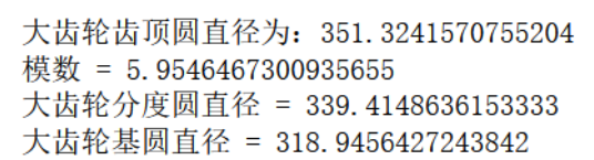 1 def get_D(): 2 '''求大齿轮齿顶圆直径''' 3 def get_maxR(out1_img, row_range): 4 '''计算给定齿形片段到圆心的最大距离''' 5 distances = [] 6 for row in range(row_range[0], row_range[1]): 7 for col in range(70): 8 if out1_img[row, col] == 255: 9 distance = np.sqrt( (228-row)**2 + (191-col)**2 ) 10 distances.append(distance) 11 break 12 return max(distances) 13 R1 = get_maxR(Out1, (150, 200)) 14 R2 = get_maxR(Out1, (200, 250)) 15 R3 = get_maxR(Out1, (250, 300)) 16 R_1 = (R1+R2+R3)/3 #取三个最大距离的平均值 17 return R_1 * 2 18 19 Da = get_D() # 得到大齿轮齿顶圆直径为 351.324 20 print(f'大齿轮齿顶圆直径为:{Df}') 21 mod_num = Da/(gear_num + 2) #计算模数 22 print(f'模数 = {mod_num}') 23 D = gear_num * mod_num 24 print(f'大齿轮分度圆直径 = {D}') 25 Dj = D * np.cos(np.deg2rad(20)) 26 print(f'大齿轮基圆直径 = {Dj}')
