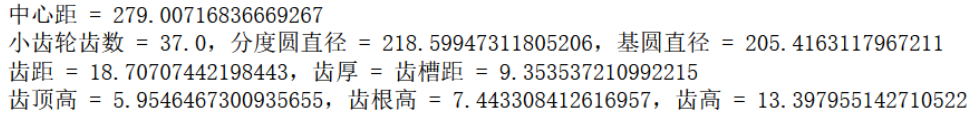 1 center_distance = np.sqrt((470-191)**2 + (226-228)**2) # 计算中心距 2 print(f'中心距 = {center_distance}') 3 4 D2 = (center_distance - D/2) * 2 5 gear2_num = round(gear_num * D2/D) 6 Dj2 = D2 * np.cos(np.deg2rad(20)) 7 print(f'小齿轮齿数 = {gear2_num},分度圆直径 = {D2},基圆直径 = {Dj2}') 8 9 gear_d = np.pi * mod_num 10 print(f'齿距 = {gear_d},齿厚 = 齿槽距 = {gear_d/2}') 11 ha = 1 * mod_num 12 hf = 1.25 * mod_num 13 h = ha + hf 14 print(f'齿顶高 = {ha},齿根高 = {hf},齿高 = {h}')