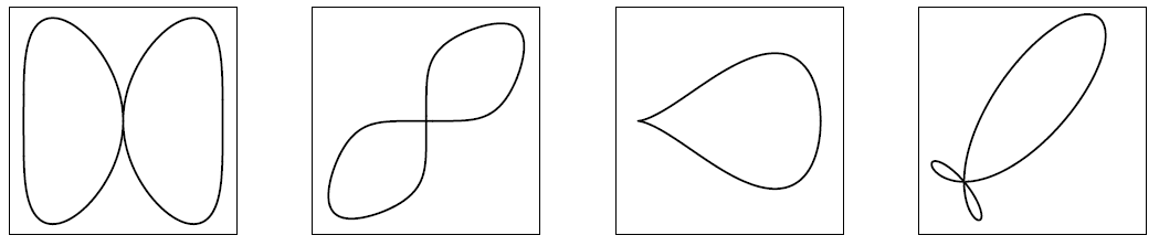 直观而言,奇异点是曲线上切线未被良好定义的点,或者是曲线自身相交的点。以下是四个在\(\mathbb{R}\)上具有奇异点的曲线示例(分别为 tacnode(重结点),node(结点),cusp(尖点),triple point(三重点)):