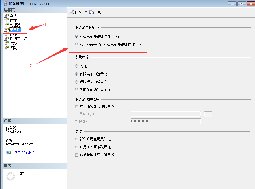 1.打开 SQL Server Management Studio,用Windows身份验证登录后鼠标右键 对象资源管理器出现下图的步骤,选择SQL Server 和Windows身份验证模式,确定