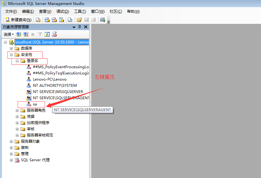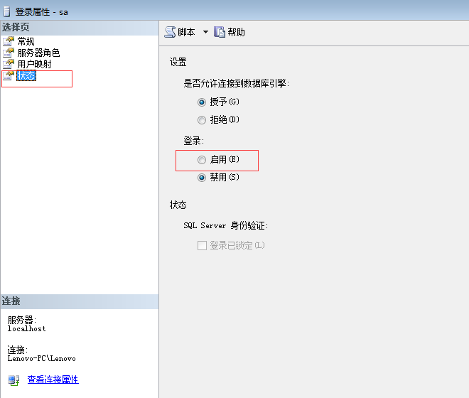 2.打开 SQL Server Management Studio,用Windows身份验证登录后,按照下图步骤点击安全性,点击登录名,选择你需要登录的账户,鼠标右键属性常规里面修改账户的密码,然后再点击属性的状态中,在启动栏勾选启动一项,然后确定