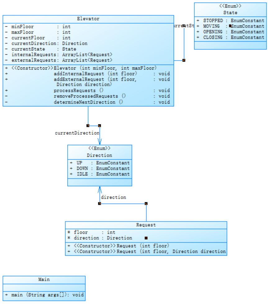 请编写一个Java程序,设计一个电梯类,包含状态管理、请求队列管理以及调度算法,并使用一些测试用例,模拟不同的请求顺序,观察电梯的行为是否符合预期,比如是否优先处理同方向的请求,是否在移动过程中处理顺路的请求等。为了降低编程难度,不考虑同时有多个乘客请求同时发生的情况,即采用串行处理乘客的请求方式(电梯只按照规则响应请求队列中当前的乘客请求,响应结束后再响应下一个请求)