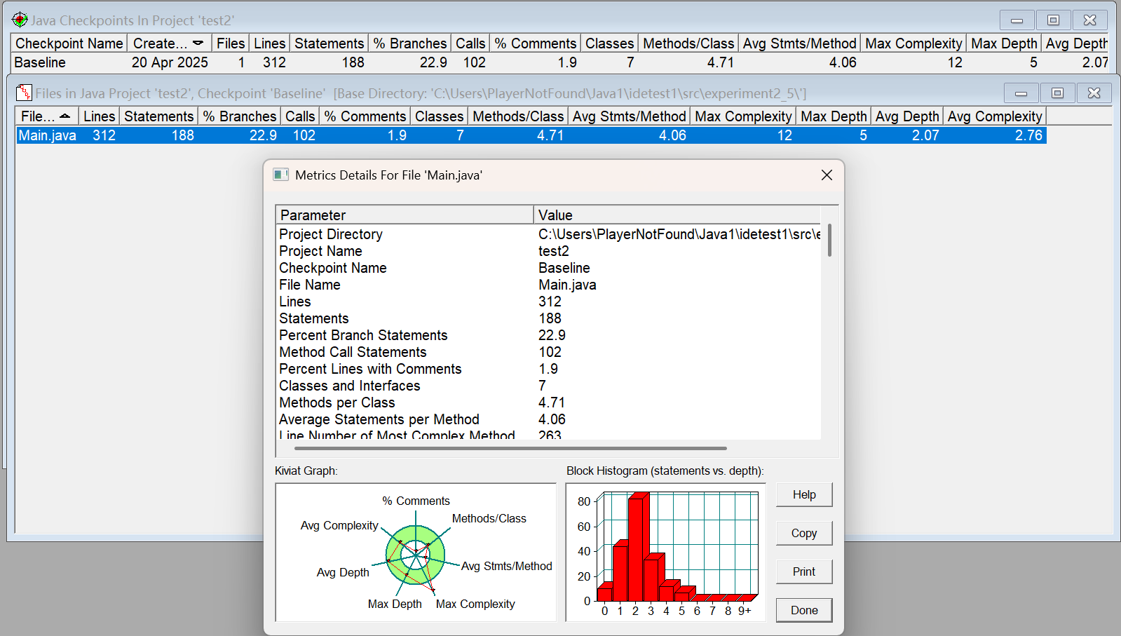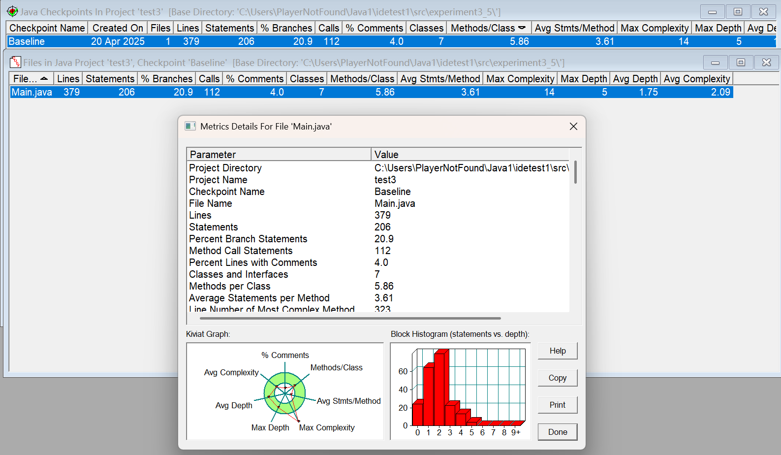 根据报表内容,分支语句占比22.9%,较第一次迭代有所下降,表明条件判断逻辑占比减少。方法调用数达102次,显示模块间交互频繁,但高频的方法调用也提示要关注耦合度。类数量为7个,每类平均方法数为4.71,平均每方法语句数为4.06,但最大复杂度为12,说明存在个别复杂方法需优化。第二次迭代相较于第一次迭代引入了Controller和RequestQueue,使系统架构更清晰,职责更单一,Elevator类的方法细化提升了控制的精准性。这些设计虽然增加了类的数量,但增强了系统的可扩展性。