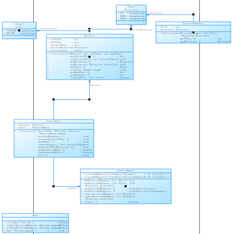 对之前电梯调度程序进行迭代性设计,目的为解决电梯类职责过多的问题,类设计要求遵循单一职责原则(SRP),要求必须包含但不限于设计电梯类、乘客请求类、队列类以及控制类,具体设计可参考如下类图。