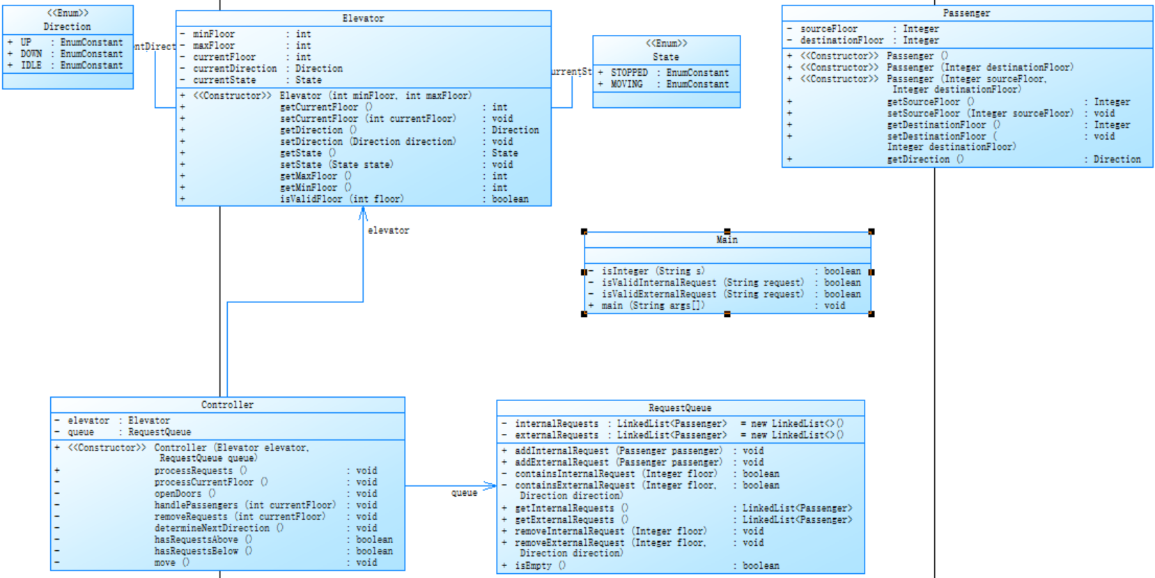 对之前电梯调度程序再次进行迭代性设计,加入乘客类(Passenger),取消乘客请求类,类设计要求遵循单一职责原则(SRP),要求必须包含但不限于设计电梯类、乘客类、队列类以及控制类,具体设计可参考如下类图。
