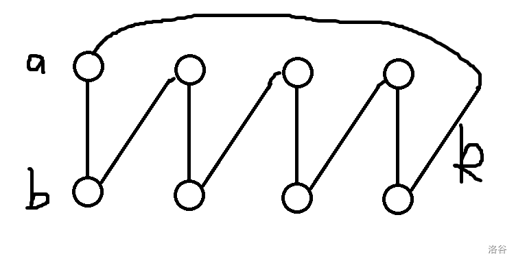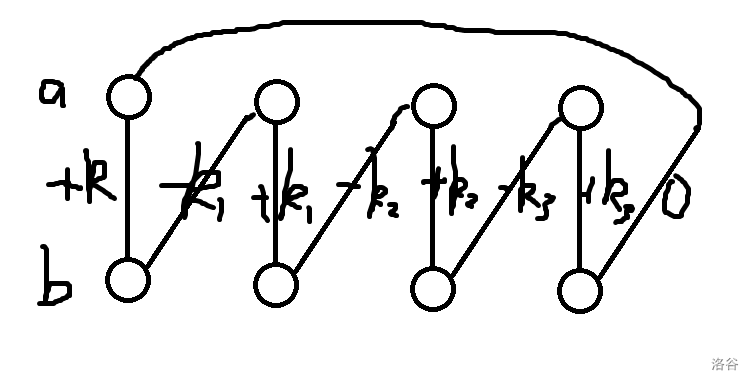 如图,假设k是所有\(bi\)为\(a(i+1)\)提供的连接中最小的一个,我们可以尝试删去\(k\),那么\(b1\)到\(a1\)就增加了\(k\),\(b1\)到\(a2\)就减少了一个小于等于\(k\)的数……具体如图: