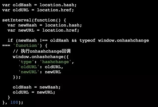 从兼容性上来讲,前面有提及hash的方式兼容性更好。然而,对于低版本的浏览器,例如IE6等等,不支持 hashchange 事件。这个时候我们只能通过 setInterval 设置心跳的方式去模拟 hashchange。