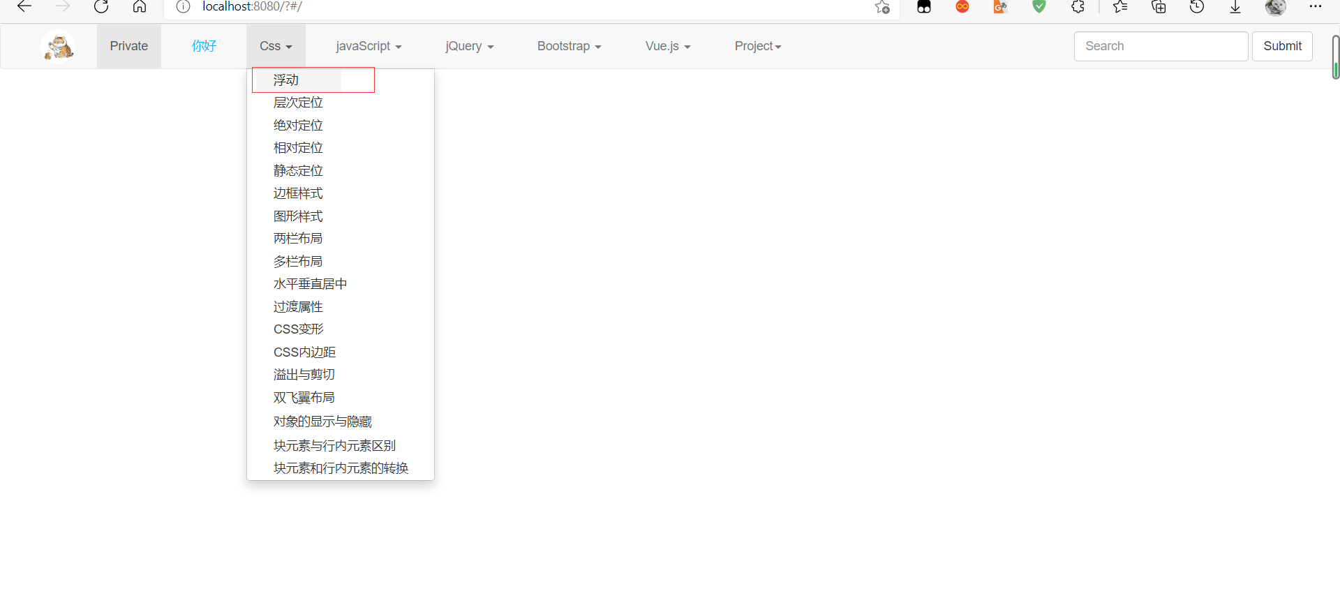 继续把页面都引入进去了,把css菜单内容写完了,放服务器上面跑了一下,跳转都是正常的了。就是还有一个问题,我css菜单的第一个页面跳转不了,不知道怎么的,它下面的页面都可以跳转就第一个不可以,我把样式代码都拿出来跑了一下,代码是正确的,不知道怎么第一个就跳转是白屏。然后我发现我不知道有些代码写在哪里,JavaScript的代码我不知道写在哪里,我vue视频目前才看了一点,那只能这个后面内容得过几天在写了。服务器网站是http://yuprivate.top/#/