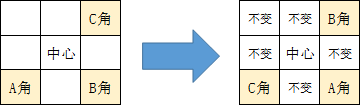 实现: A绿角(红白绿)-->B兰角(绿白粉)-->C红色(红兰白),对换,白色面不变。