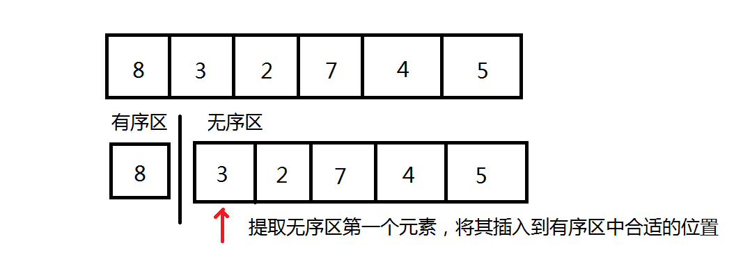 把输入的数组的第一个元素定义为有序区(只有一个元素,怎么放都有序),其余的元素都定义在无序区中。