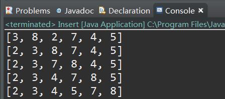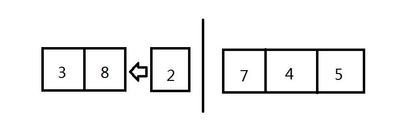 对数组{8, 3, 2, 7, 4, 5}进行排序,每一步插入的过程如下: