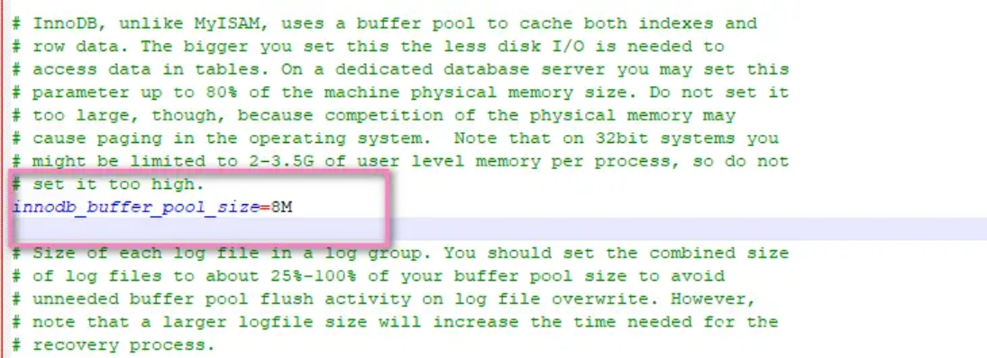C:\ProgramData\MySQL\MySQL Server 8.0目录下找到my.ini或者my配置文件,打开文件找到"innodb_buffer_pool_size"