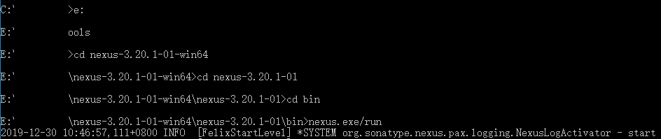 正确的操作方式是,打开命令行,通过 cd 的方式进入nexus-3.20.1-01目录,再进入 bin 目录,输入:nexus.exe/run命令,等待执行完成。