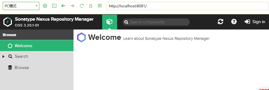 启动完成后,nexus默认端口为8081。在浏览器输入:http://localhost:8081